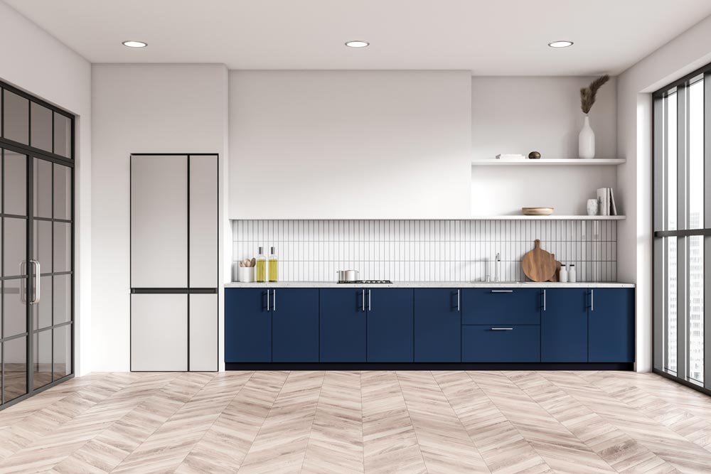 1. พื้นที่ 3-5 ตร.ม. ควรจัดวางครัวเป็นรูปตัว i (i-Shaped Kitchen) เป็นครัวที่มีเคาน์เตอร์ครัวติดผนังด้านใดด้านหนึ่ง หรือเรียกอีกอย่างหนึ่งว่า One wall Kitchen เหมาะกับพื้นที่ขนาดเล็ก ซึ่งส่วนใหญ่จะเป็นคอนโดมิเนียมหรือทาวน์เฮ้าส์ ครัวลักษณะนี้มักจะมีพื้นที่ทั้ง 3 โซน อยู่ในแถวเดียวกัน