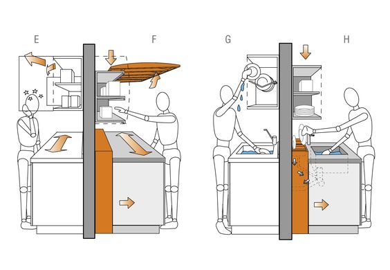 ห้องครัวที่สามารถใช้งานได้อย่างสะดวกสบาย จะต้องออกแบบให้ถูกต้องตามสรีรศาสตร์ หรือ Ergonomic ซึ่งหมายถึง การศึกษาสภาพแวดล้อมโดยรอบเพื่อความเหมาะสมกับการทำงานหรือการใช้งาน หากต้องออกแบบห้องสักห้องหนึ่ง อย่างห้องครัว ที่ทุกคนในบ้านต่างต้องใช้งานร่วมกัน เพื่อให้ได้ระยะต่างๆ อย่างเหมาะสม Ergonomic ถือเป็นจุดเริ่มต้นการออกแบบที่สำคัญในการออกแบบส่วนต่างๆ ให้สัมพันธ์กับการใช้งาน ทั้งระยะการหยิบจับสิ่งของได้สะดวก และปลอดภัยต่อผู้ใช้งานเอง