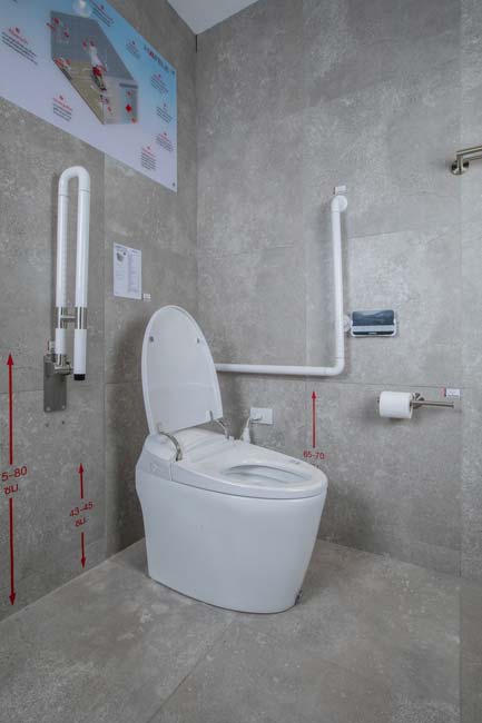 - เลือกใช้โถสุขภัณฑ์ที่มีความสูงจากพื้นประมาณ 43-45 เซนติเมตร เพื่อให้ผู้สูงอายุสามารถลุกนั่งได้อย่างสะดวก และที่กดน้ำต้องเป็นแบบคันโยก