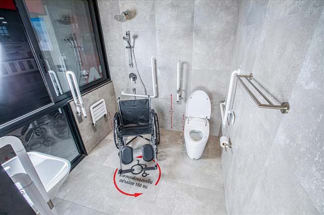 - ภายในห้องน้ำ ควรจะมีระยะหมุนตัวสำหรับรถเข็น ไม่น้อยกว่า 150 เซนติเมตร