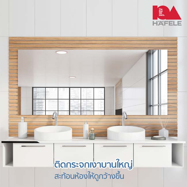 การติดกระจกเงาในห้องน้ำจะช่วยสะท้อนภาพเท่าขนาดความเป็นจริงของห้อง ยิ่งใหญ่เท่าไหน ห้องก็จะยิ่งดูกว้างเท่านั้น