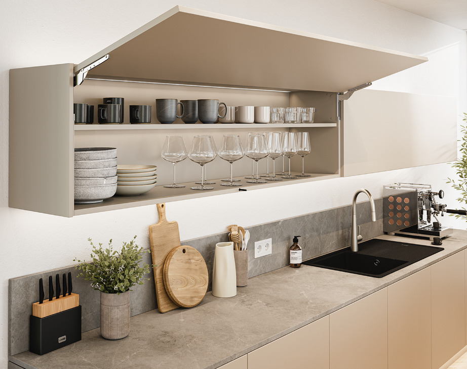Häfele Free Slim covers the entire range of flap applications with just a few fitting types – across all opening types.