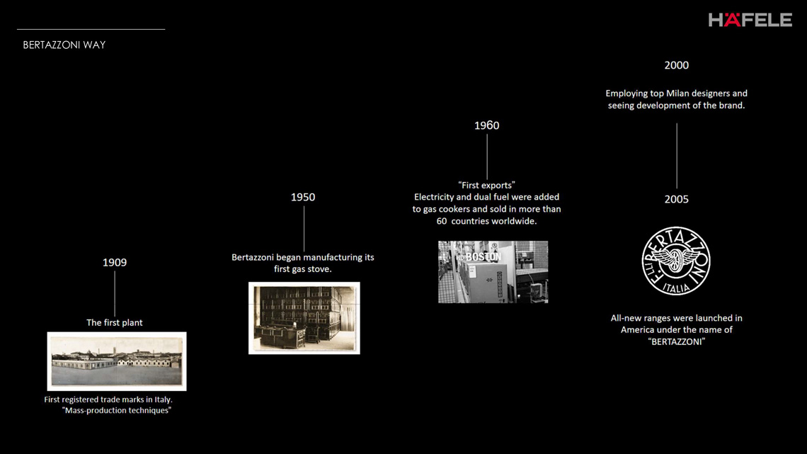 ครอบครัว อาหาร วิศวกรรม สิ่งเหล่านี้ผสมผสานกันอยู่ในใจของ Francesco และได้รับการส่งต่อผ่านทายาททั้ง 6 รุ่นของ Bertazzoni ทุกวันนี้คำทั้ง 3 ได้กลายเป็นนิยามของแบรนด์ จุดเริ่มต้นจากแรงบันดาลใจในการค้นพบเตารถไฟ Francesco และลูกชายของเขา Antonio จึงเริ่มปรับแต่งให้เข้ากับจุดประสงค์ของตนเอง พวกเขาจึงผลิตเตาปรุงอาหารสำหรับใช้ในท้องถิ่นรอบๆ เมืองกัสตัลลา ที่เดียวกับโรงงานแห่งแรก ไม่นานนักเตาของเขาก็ถูกขายไปทั่วอิตาลี และในปี ค.ศ. 1909 ทายาทรุ่นต่อมา Napoleone Bertazzoni ก็ได้สร้างโรงงานขึ้นริมสถานีรถไฟ เพื่อเป็นเครื่องเตือนใจถึงแนวคิดดั้งเดิมและยังอยู่ในทำเลที่สมบูรณ์แบบสำหรับการขนส่งที่สามารถกระจายเตา Bertazzoni ออกไปได้ไกลยิ่งขึ้น เตาของพวกเขาถูกตั้งชื่อตราสินค้าว่า La Germania เพื่อเป็นที่ระลึกถึงแรงบันดาลใจของสถานีรถไฟที่เป็นต้นทางของเขา และพวกเขาก็เริ่มได้รับรางวัลด้านคุณภาพจากการออกแบบผลิตภัณฑ์ Napoleone ได้นำเทคนิคการผลิตจำนวนมาก จากการเรียนรู้จากอุตสาหกรรมการผลิตรถยนต์ที่กำลังเติบโตในภูมิภาคนี้