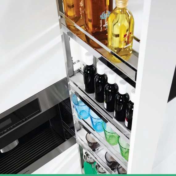 ด้วยประสบการณ์อันยาวนานของเราในการทำอุปกรณ์ชุดครัวให้กับห้องครัวในหลากหลายรูปแบบ เบื้องหลังบานประตูตู้เฟอร์นิเจอร์ที่ปิดอยู่ เราได้สร้างสรรค์และปฏิวัติระบบช่องเก็บของสู่รูปแบบใหม่ เพื่อให้มั่นใจได้ว่า ภาชนะห้องครัว แก้ว หม้อ และกระทะ รวมถึงอุปกรณ์ในการประกอบอาหารของคุณ จัดเก็บง่ายและสะดวกในการหยิบใช้งานที่สุด ด้วยการออกแบบของเราได้เพิ่มความสะดวกสบายและประสิทธิภาพภายในห้องครัว ทำให้เรามั่นใจได้ว่า ผู้ใช้งานจะพบประสบการณ์อันสนุกสนานในการประกอบอาหาร นอกเหนือจากสินค้าของเราจะมีเทคโนโลยีที่เหนือชั้น และล้ำสมัยแล้ว เราก็ไม่ลืมที่จะให้ความสำคัญกับรูปลักษณ์ที่สวยงาม วัสดุที่ดีเยี่ยม การผลิตด้วยมาตรฐานระดับสูง รวมถึงความโดดเด่นอันเป็นเอกลักษณ์ของทุกๆ รายละเอียด เป็นความเพลิดเพลินที่คุณหาได้ในสินค้าของเรา