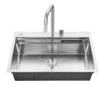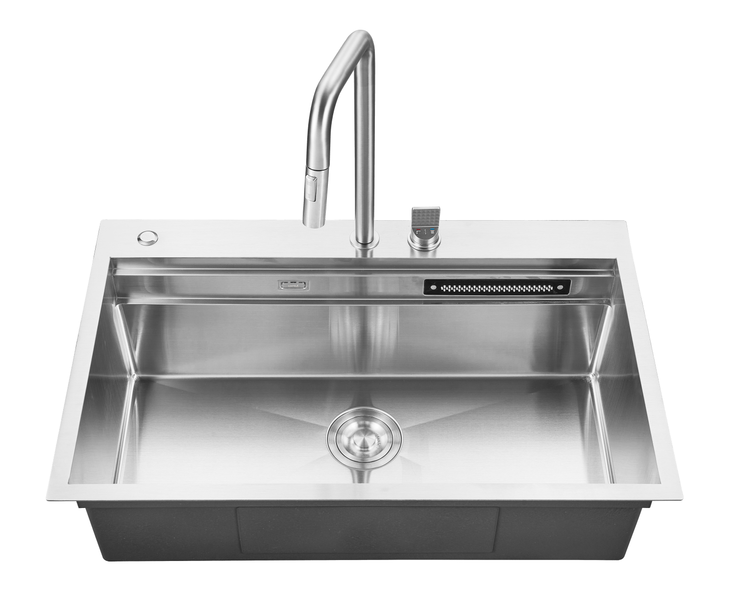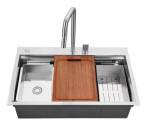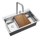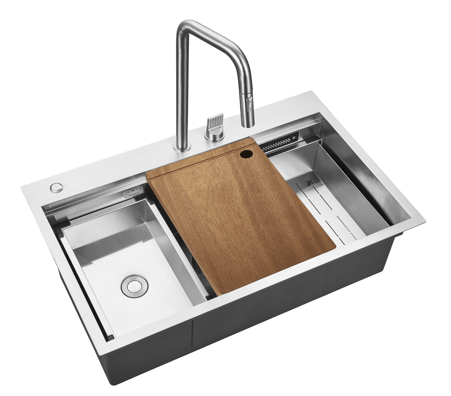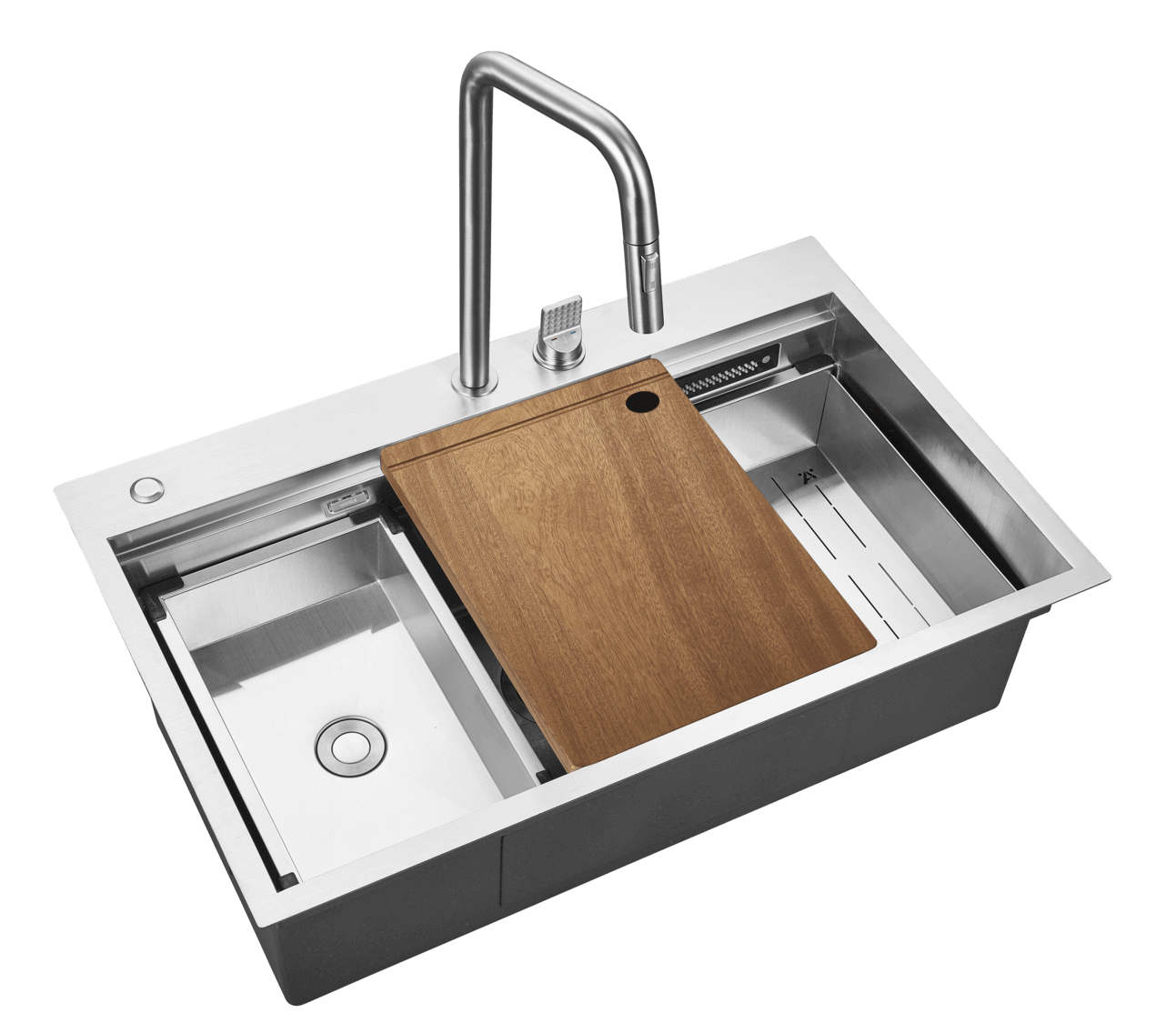 • Equipment: 3.5-inch sink drain, drain pipe, overflow pipe, pull-out mixer tap, vegetable and fruit washing basket, vegetable and fruit washing basin, and wooden cutting board.
