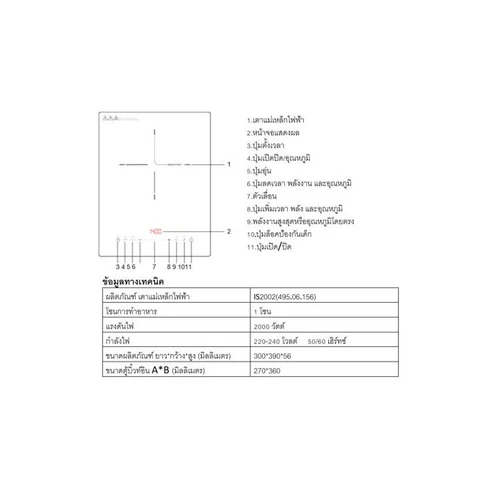 • 1 หัวเตาอินดักชัน: ขนาด Ø200 มม. (กำลังไฟ 2,000 วัตต์) – Power Booster