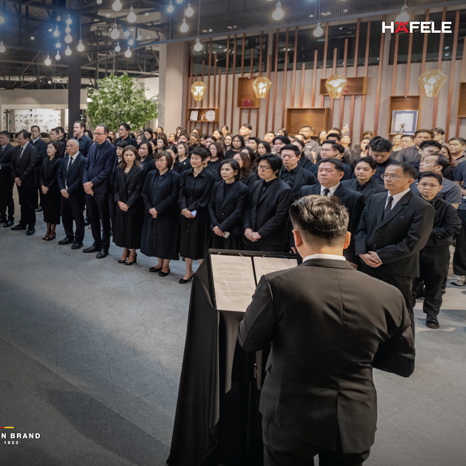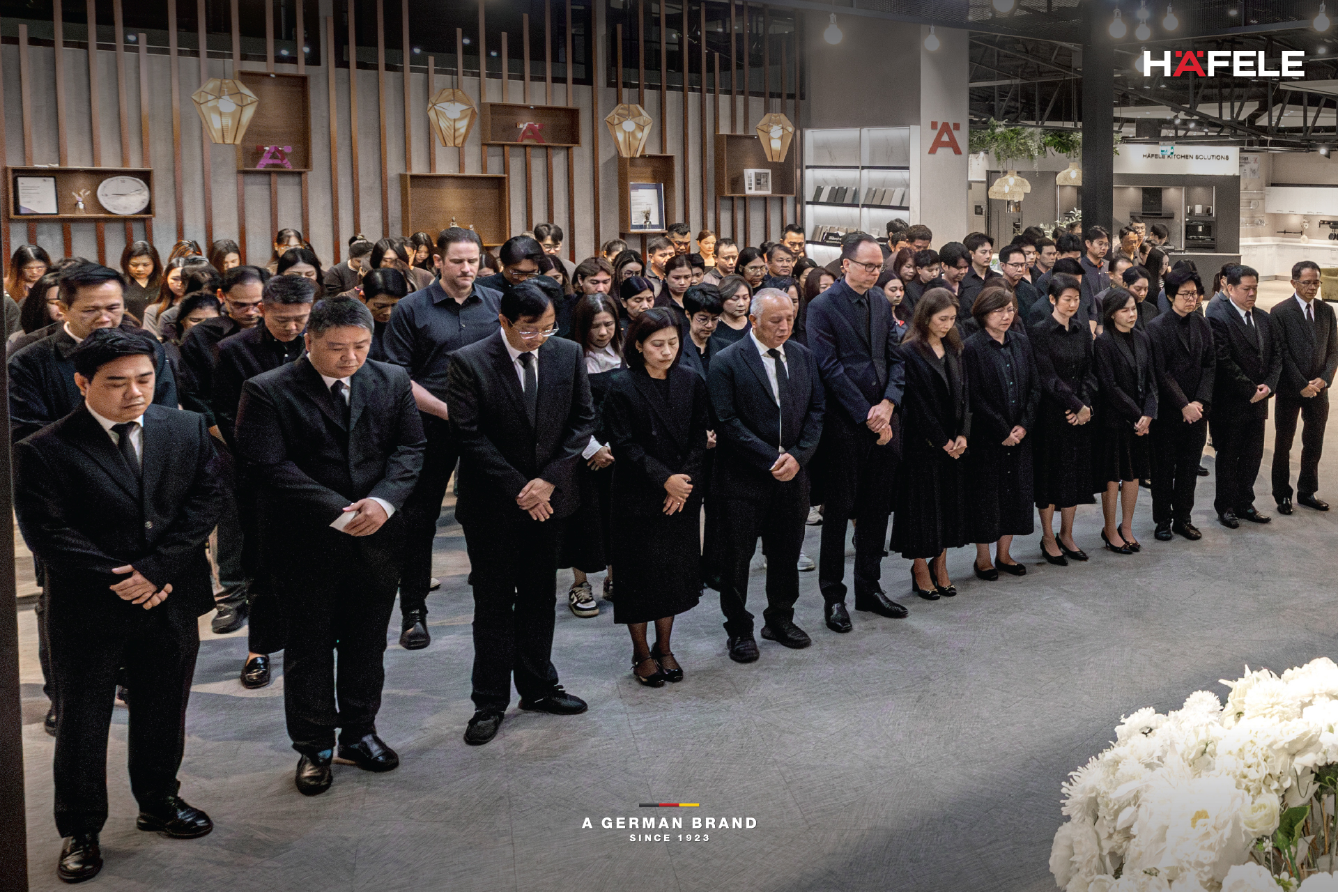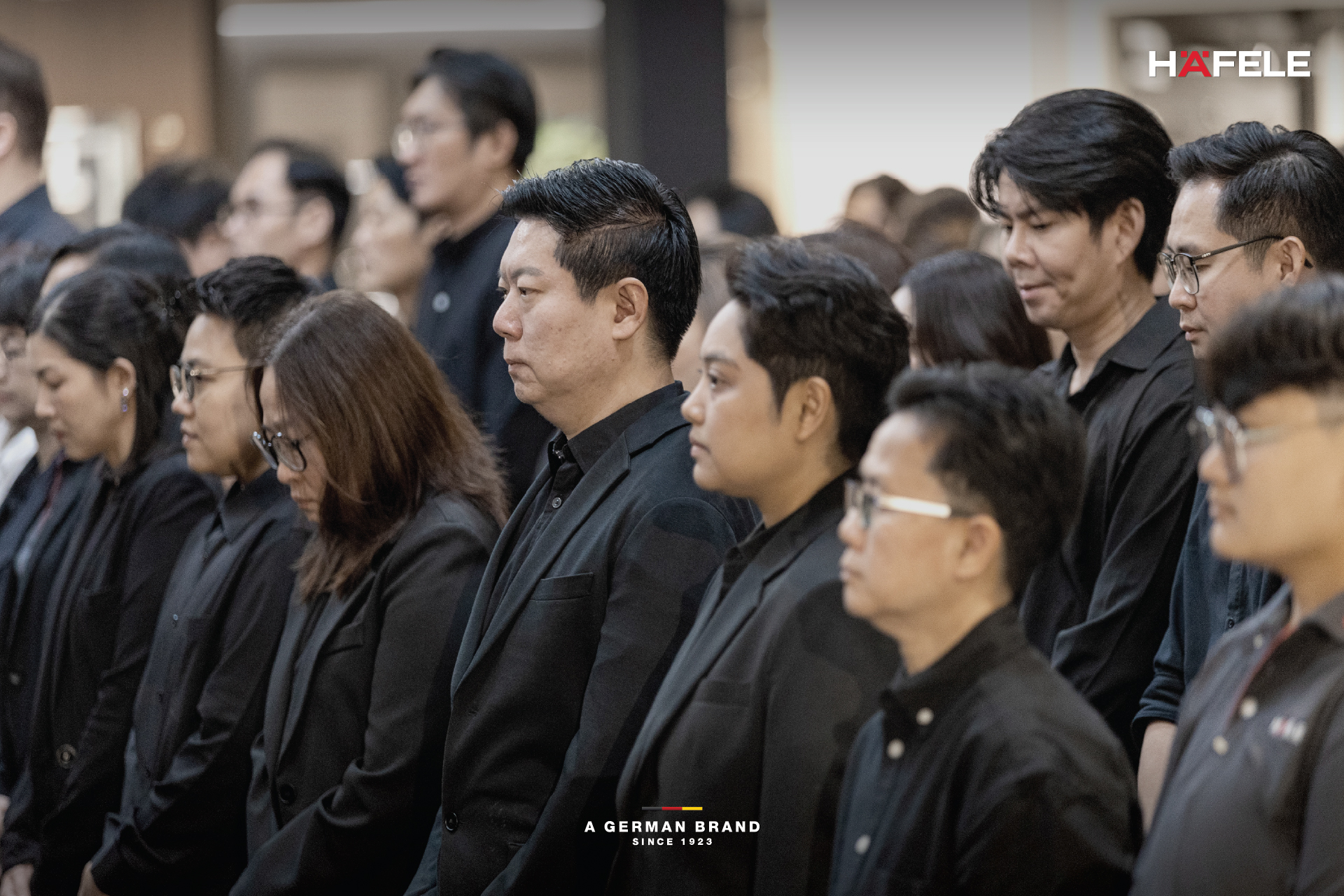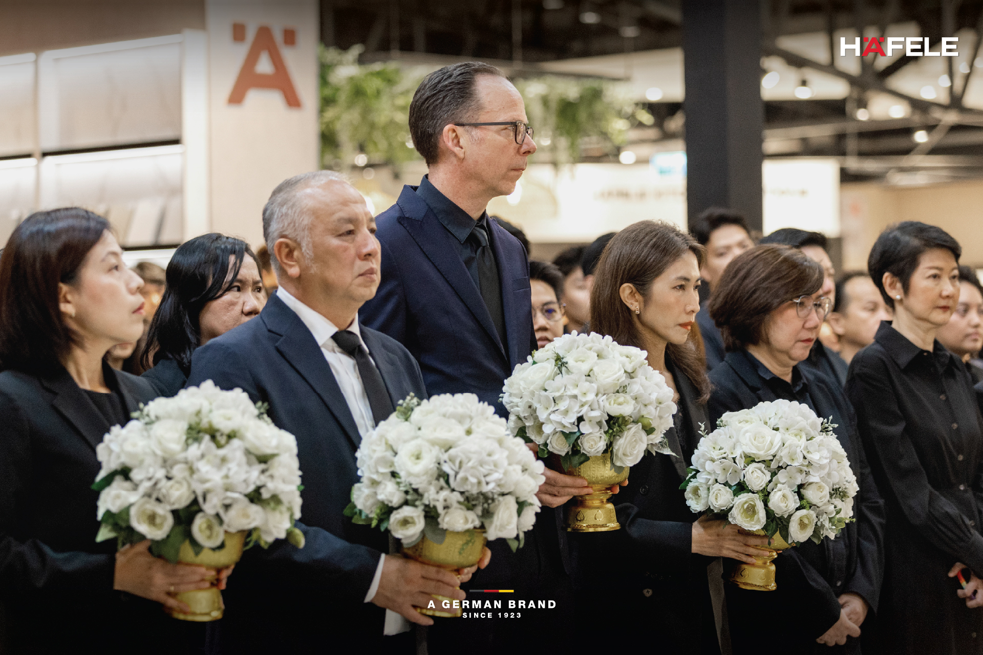 A tribute ceremony was held at Häfele Design Studio, Bangkok, led by Mr. John Clare, together with Mr. Rattana Poonsanga, Ms. Saowanee Sermsupakornwong, Ms. Bhornthip Nukulwutti-opas, the management team, and Häfele employees, who gathered to pay their respects and express heartfelt remembrance of Her Majesty’s immeasurable compassion.