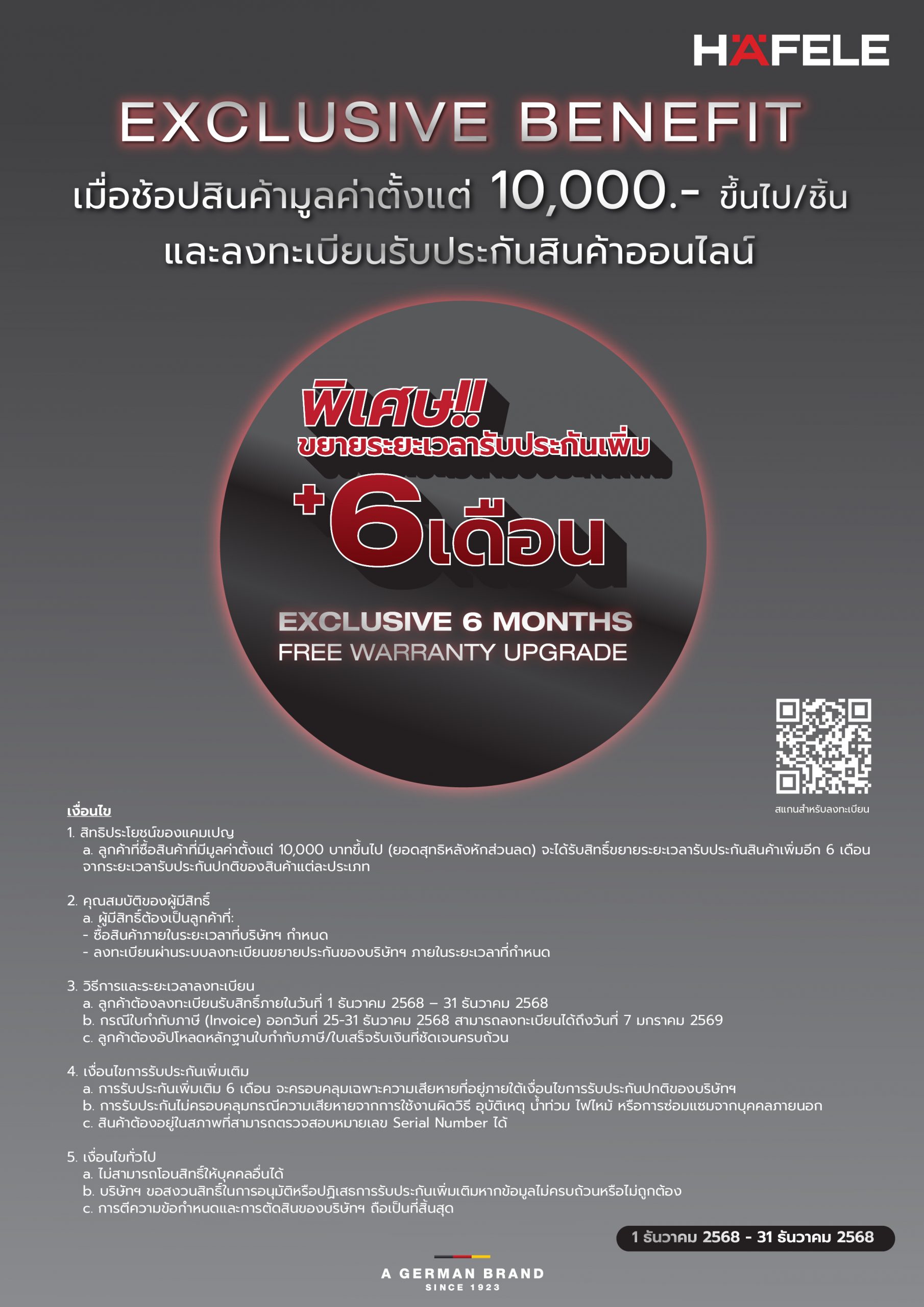 เมื่อช้อปสินค้า HAFELE ตั้งแต่ 10,000 บาท ขึ้นไป พิเศษ! ขยายระยะเวลารับประกันเพิ่ม 6 เดือน